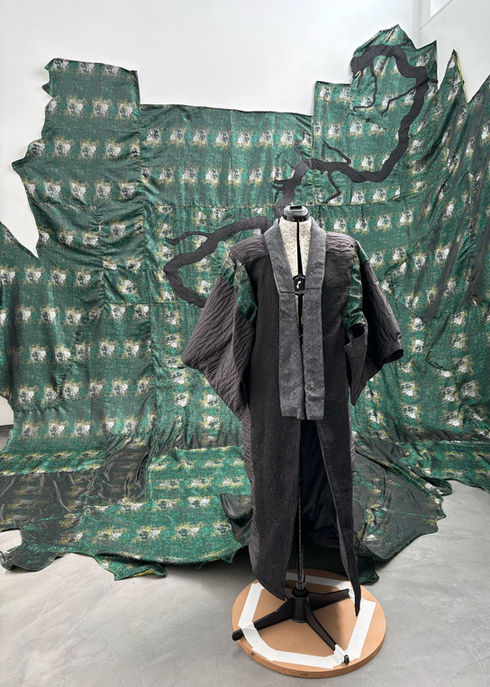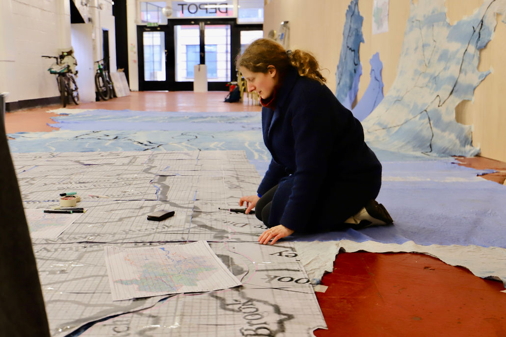 It is a community-created 15m long wearable robe which features a to-scale hydrological mapping of the Thames watershed from source to sea. It is composed of 65 pieces of mix-fibre recycled jacquard fabric, with each piece covering one of the many tributaries of the Thames watershed. The rivers themselves are quilted on and made from hand–textured gathered silk. Eventually, each will be fully embroidered by workshop participants to depict their memories, experiences, and stories of the river. The lining, muslin hand-dyed with indigo, will depict the pollution data, sewage leaks, aquatic biodiversity crisis and all the monitoring carried out over the course of the project. Eventually, the robe will look like a single drop of water, when seen from above. It will be assembled piece by piece, tributary by tributary, story by story.